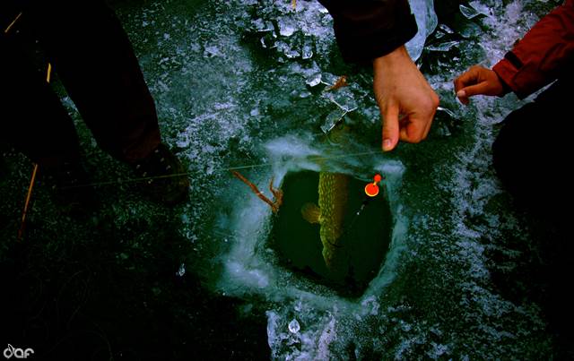 Auf dem See angekommen, wurden nach und nach alte Löcher mit der Axt vom neuen Eis befreit und langsam die Montagen ausgerollt. Die Montage, mit der wir fischten, war denkbar einfach. Monofile auf einer Schnurrolle, Laufpose (ca. 20–25gr), Blei, Wirbel und kräftige Salzwasserschur als Vorfach mit einem Drilling und Köderfisch bestückt. Die Schnurspule wurde ein paar Meter neben dem Eisloch auf erhöhter Position platziert, so dass sie als Bissanzeiger dient und der Hecht beim Biss ohne Widerstand abziehen kann. Der Köderfisch selber wurde cirka 2m über dem Grund angeboten. Gefischt wurde in verschiedenen Eislöchern an einer Kante mit Tiefen von cirka 5–11 Metern.